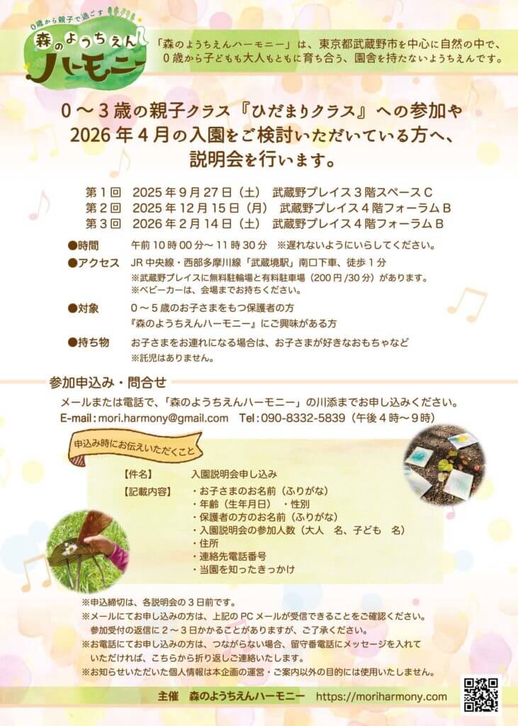 2026年度説明会を行います。『ひだまりクラス』への参加や、2026年度4月の入園をご検討している方へ、説明会を行います。 投稿日 2025-09-20 更新日 2025-12-02 カテゴリー お知らせ カテゴリー ひだまり カテゴリー 入園 シェア ツイート 投稿 LINE フィード