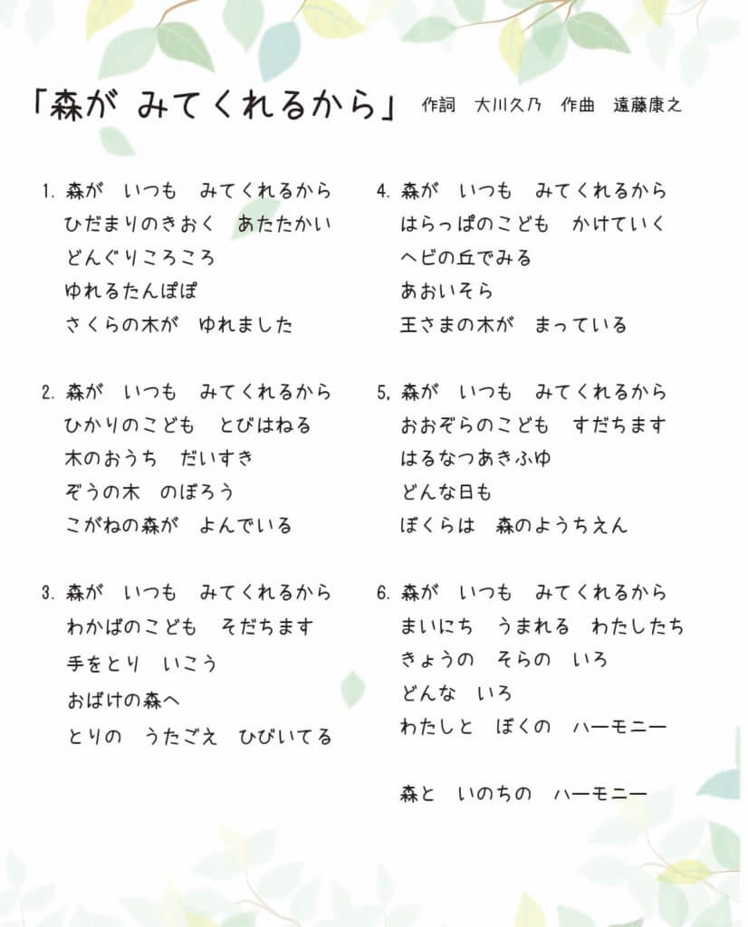 大切にしていること 一人一人がリラックスして、安心や喜びを感じて過ごすこと わかち合うこと 自分を信じること、仲間や家族を信じること 助け合い、ともに育つこと 安全で健やかな生活 【目指す子ども・大人像】 自分を愛する人、人や自然を愛する人 保護者の声 森のようちえん「子どもクラス」概要さらに詳しく 森のようちえん「0~3歳の親子クラス」概要さらに詳しく 体験さらに詳しく スタッフ紹介さらに詳しく 子育て応援地域開放事業さらに詳しく 寄付さらに詳しく